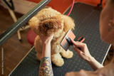 Caucasian young adult woman grooming fluffy dog on grooming table, holding dogs head gently while brushing fur, visible tattooed arm, professional pet care setting