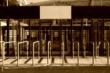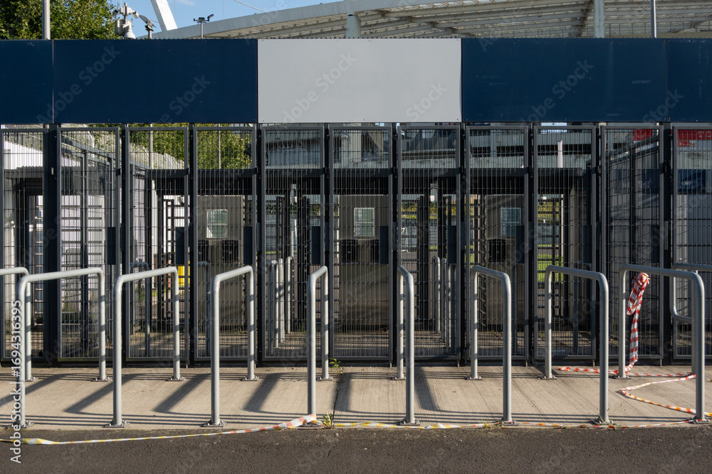 The entrance area to the stadium is filled with ticket offices and barriers, and there is a security checkpoint in a public space