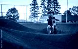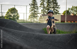 Child wearing a safety helmet rides a bike over asphalt hills on a pump track