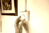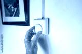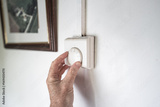 Homeowner adjusting a central heating thermostat in the hallway of a grade 2 listed farmhouse. The house is becoming cold and the heating is being turned up.
