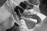 Black female doctor measuring blood pressure of young adult Black woman using medical sphygmomanometer in clinical setting, both subjects partially visible, focusing on healthcare procedure