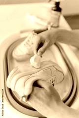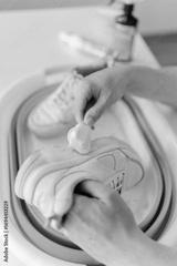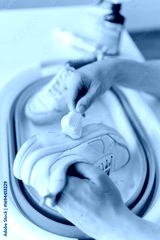 Close-up hands of unrecognizable man cleaning white sneaker with brush and cleaning foam, restoring pristine condition in convenient cleaning basin. Concept of shoe maintenance and hygiene.