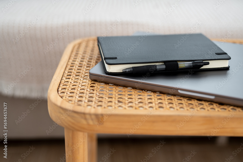 Black notebook with pen placed on closed silver laptop lying on wicker wooden table next to bed inside cozy modern home interior with soft natural light