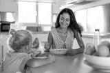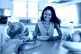 Happy mother and child having breakfast together in kitchen, woman eating cereal with milk while boy enjoys fresh croissants, healthy family morning meal at home