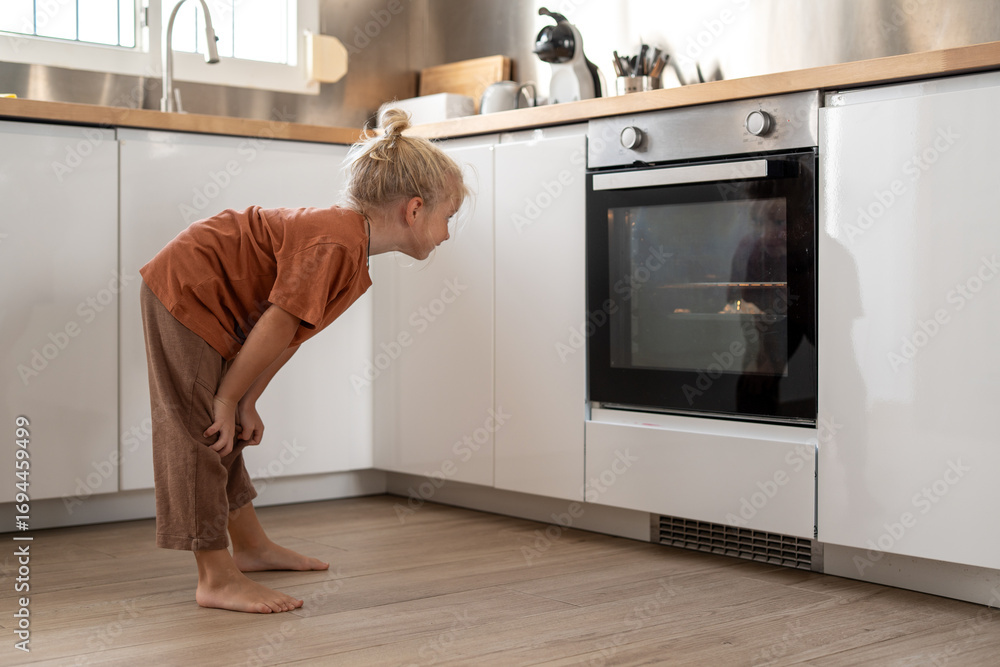 Curious young boy in brown clothes bending forward and looking into oven while waiting for food to bake in modern bright kitchen