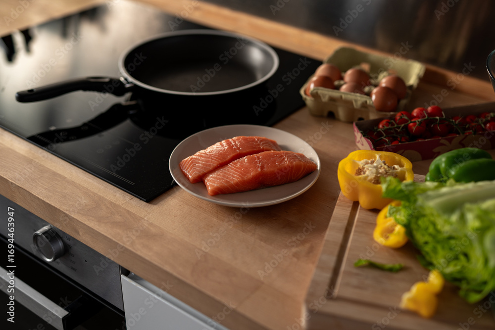 Fresh salmon fillets on a plate beside vegetables and eggs on wooden kitchen counter with cutting board and frying pan, healthy ingredients ready for cooking