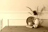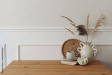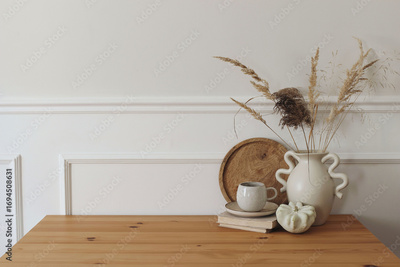 Autumn, fall still life. Dry grass,plant bouquet in modern boho ceramic vase. Old books, cup of tea, coffee, white pumpkin and round wooden tray on table. White wall background. Scandinavian interior.
