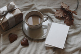 Autumn still life. Cup of coffee, gingerbread cookies on linen table cloth. Gift box with ribbon, oak tree branch, leaves. Fall breakfast, stationery. Blank greeting card, invitation mockup. Flat lay