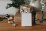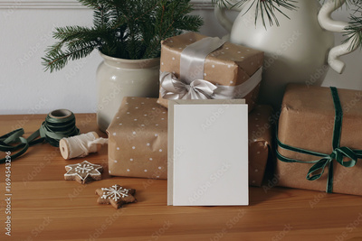 Cozy Christmas scene with wrapped gifts in brown paper, festive ribbons, star gingerbread cookies. Blank greeting card, invitation mockup on a wooden table. Spruce tree branches in ceramic vases.