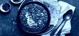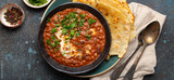 Traditional Indian Punjabi dish Dal makhani with lentils and beans in black bowl served with naan flat bread, fresh cilantro and two spoons on blue concrete rustic table top view.