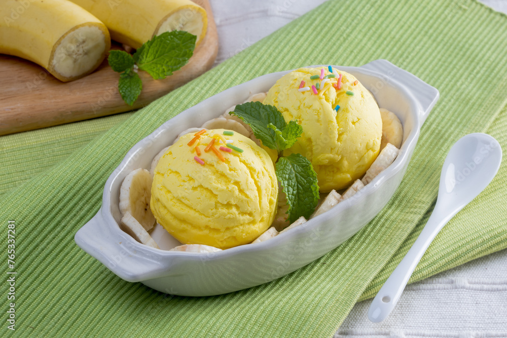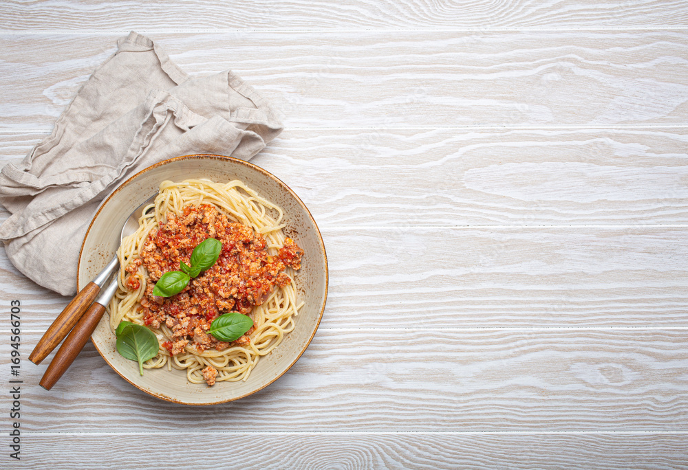 Plate of spaghetti bolognese, topped with fresh basil leaves, sits on a white wooden table with a linen napkin