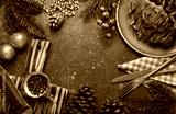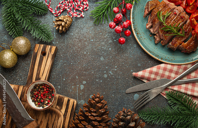 Festive Christmas dinner boarder background with space for text with roasted duck breast fillet with golden crispy skin and tomato salad, Xmas decorations with fir tree, cones, red berries..