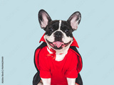 Happy Halloween. Charming puppy and Halloween costume. Dog smile. Closeup, indoors. Studio shot. Congratulations for family, relatives, loved ones, friends and colleagues. Pet care concept