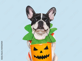 Happy Halloween. Charming puppy and Halloween costume. Close-up, indoors. Studio shot. Congratulations for family, relatives, loved ones, friends and colleagues. Pet care concept