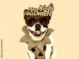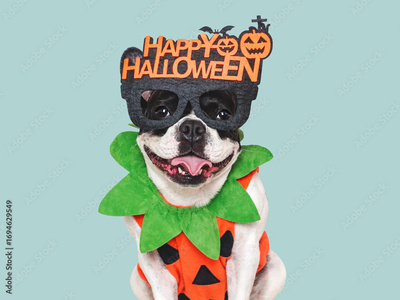 Happy Halloween. Charming puppy and Halloween costume. Dog smile. Closeup, indoors. Studio shot. Congratulations for family, relatives, loved ones, friends and colleagues. Pet care concept