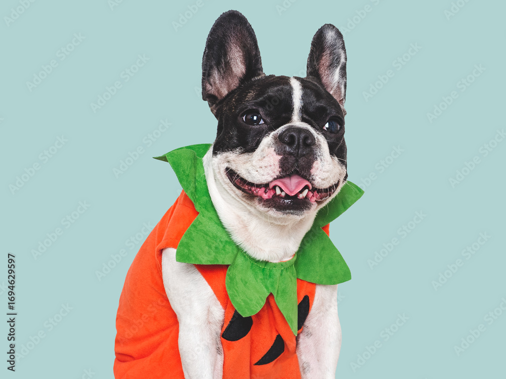 Happy Halloween. Charming puppy and Halloween costume. Dog smile. Closeup, indoors. Studio shot. Congratulations for family, relatives, loved ones, friends and colleagues. Pet care concept