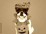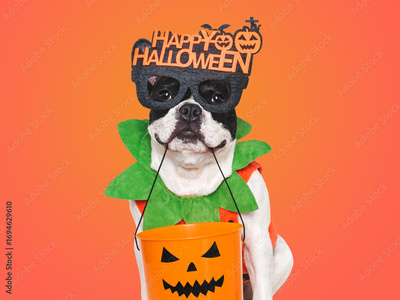 Happy Halloween. Charming puppy and Halloween costume. Close-up, indoors. Studio shot. Congratulations for family, relatives, loved ones, friends and colleagues. Pet care concept