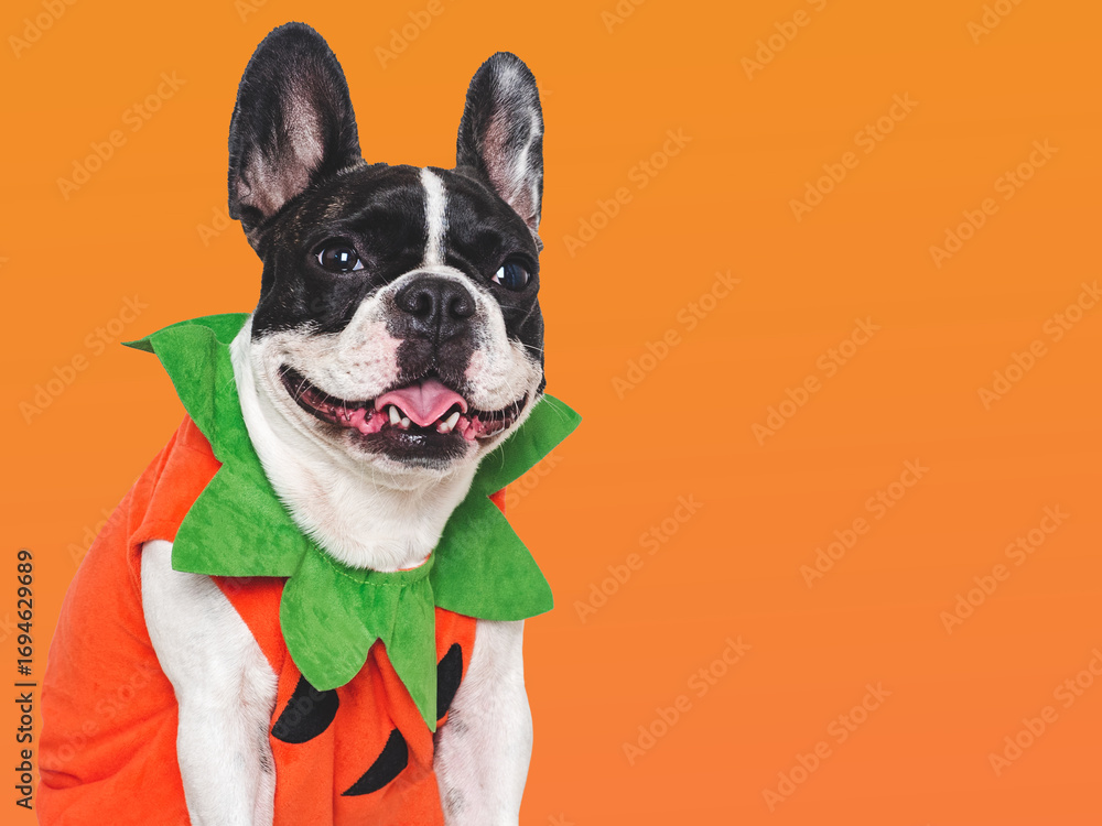 Happy Halloween. Charming puppy and Halloween costume. Dog smile. Closeup, indoors. Studio shot. Congratulations for family, relatives, loved ones, friends and colleagues. Pet care concept