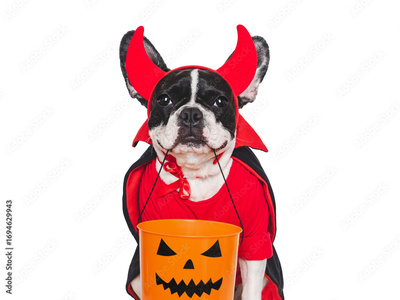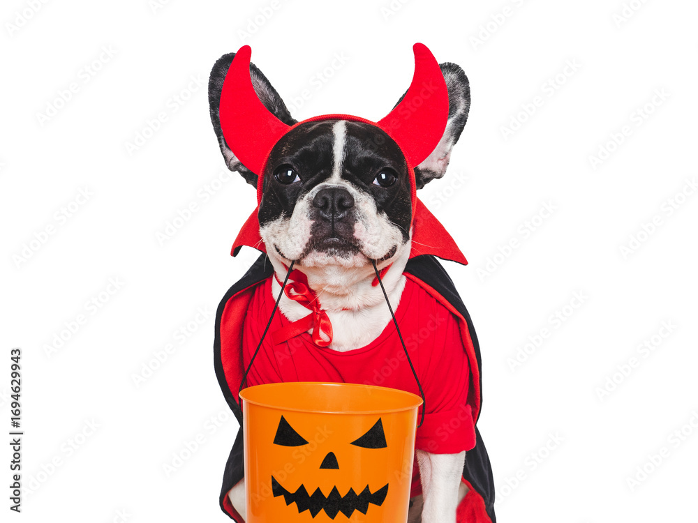 Happy Halloween. Charming puppy and Halloween costume. Close-up, indoors. Studio shot. Congratulations for family, relatives, loved ones, friends and colleagues. Pet care concept