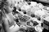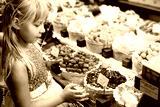 A little blonde girl is standing near a shop window with an assortment of sweets. The child chooses sweets