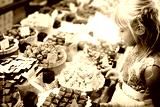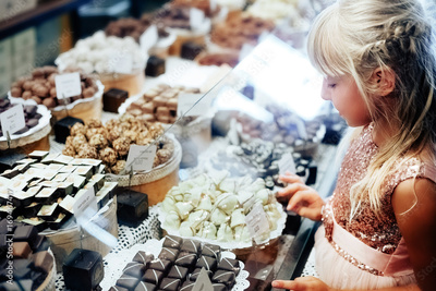 A little blonde girl is standing near a shop window with an assortment of sweets. The child chooses sweets