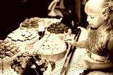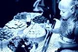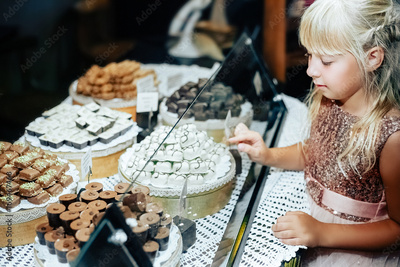 A little blonde girl is standing near a shop window with an assortment of sweets. The child chooses sweets