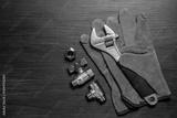 Adjustable wrench, ball valve with red handle, stainless steel tee fittings, leather safety gloves and rubber gaskets on wooden background, top view, copy space, closeup. Plumbing repair concept