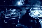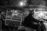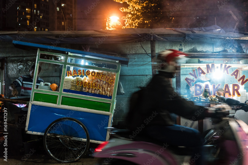 Side view of a man riding a scooter on a street with traditional food stalls in a poor district of Jakarta at night