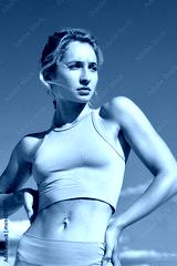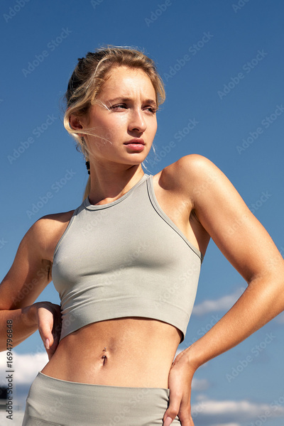 Athletic Woman in Sportswear Posing Outdoors Underneath a Clear Blue Sky