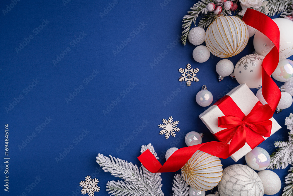 White present with red ribbon surrounded by snow-covered branches, white ornaments, and snowflakes on a blue background. Ideal for festive greeting cards, holiday banners