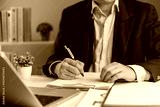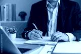 Signature, document Manager writes on contract at modern office to confirm terms and approval, organizing legal paperwork and compliance with pen beside laptop. concept corporate administration.