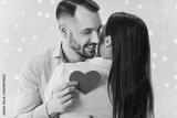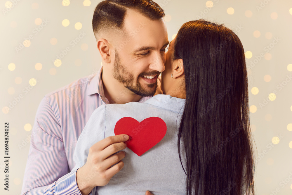 Portrait of a young happy smiling man holding red paper heart in hand and hugging brunette girl standing back indoors on lights bokeh background. Happy couple in love. Valentines day concept.