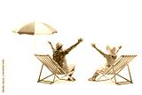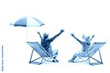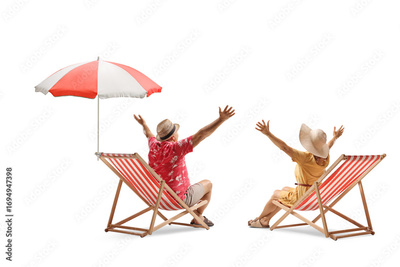 Rear view shot of a happy man and woman sitting on striped beach chairs