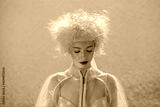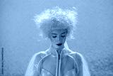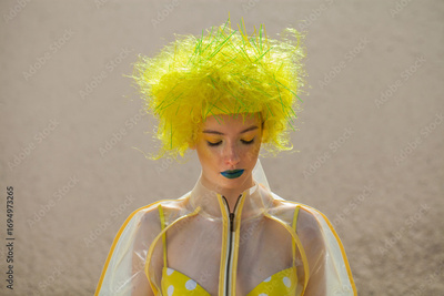 Sexy beautiful woman in a bright yellow wig and transparent raincoat
