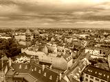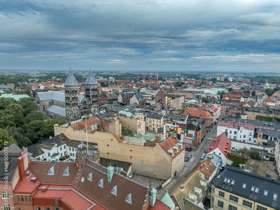 Aerial view of the medieval old town center of Lund in Sweden with University main building, Romanesque Cathedral dramatic sunset sky