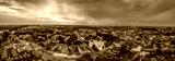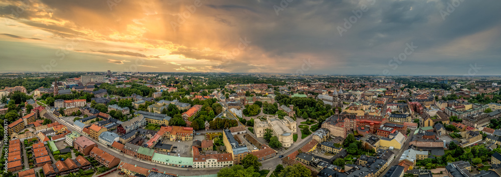 Aerial view of the medieval old town center of Lund in Sweden with University main building, Romanesque Cathedral dramatic sunset sky