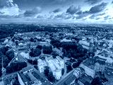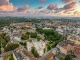 Aerial view of the medieval old town center of Lund in Sweden with University main building, Romanesque Cathedral dramatic sunset sky