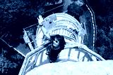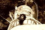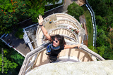 Woman on top of tower, waving happily, scenic view, sunny day. Ambuluwa. Sri Lanka