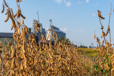 Fields of mature soybeans ready for harvest under a clear blue sky at a rural agricultural location