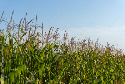 Tall corn plants reaching for the blue sky in a vibrant agricultural field during warm summer months