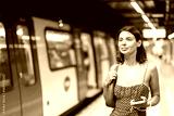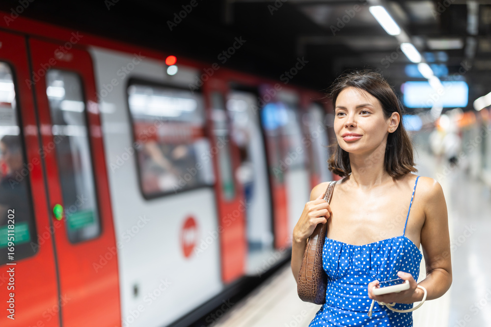Happy young girl standing on subway platform holding mobile phone and looking around