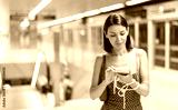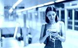 Contemplative young woman holding smartphone looking for convenient train at the station