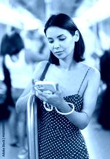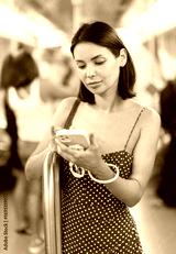 Glad young girl scrolling mobile phone while travelling in subway wagon in standing position
