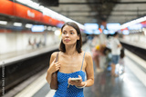 Calm young girl standing on subway platform holding mobile phone and looking around