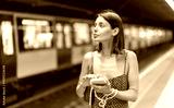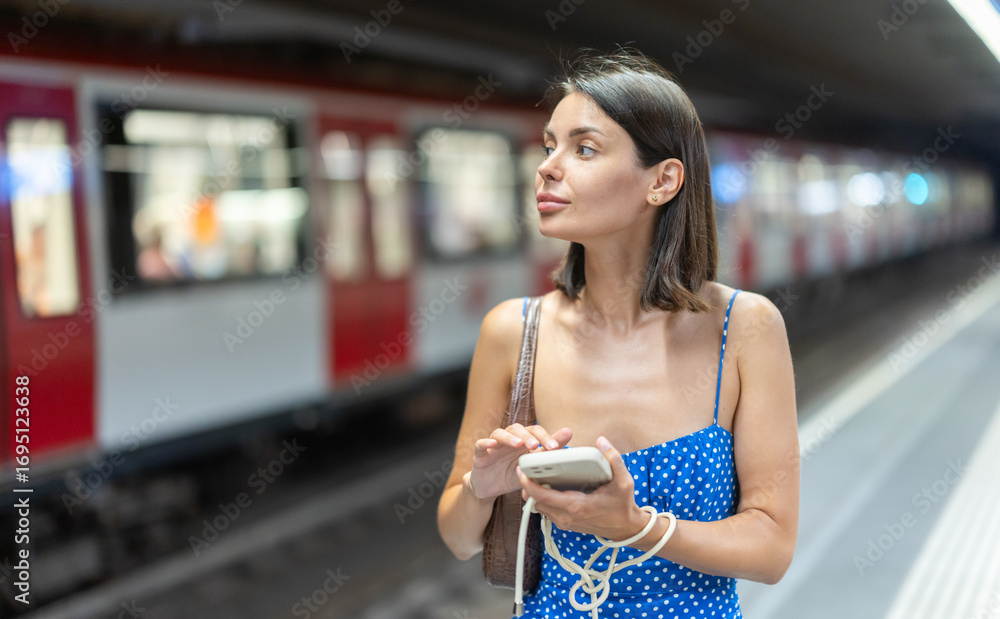 Calm young girl standing on subway platform holding mobile phone and looking around