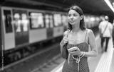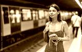 Happy young girl standing on subway platform holding mobile phone and looking around