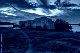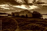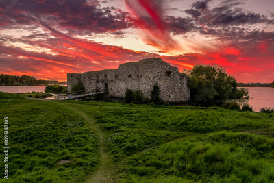 Aerial view of Kronoberg castle ruin on Helgasjön lake in Växjö Municipality in southern Småland, with dramatic sunset sky