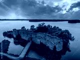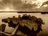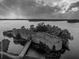 Aerial view of Kronoberg castle ruin on Helgasjön lake in Växjö Municipality in southern Småland, with dramatic sunset sky