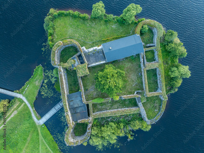 Aerial top down ground plan view of Kronoberg cast le ruin on Helgasjön lake in Växjö Municipality in southern Småland