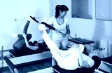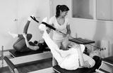 Active women of different ages, taking care of their health, perform Pilates exercises on a simulator in a fitness studio, ..where a trainer helps them adjust their movements